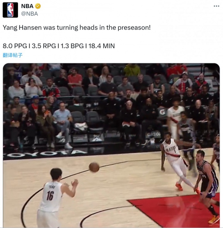 2025-10-20 01:17:46场均8分3.5板!NBA官方晒集锦和数据:杨瀚森季前赛表现抢眼!