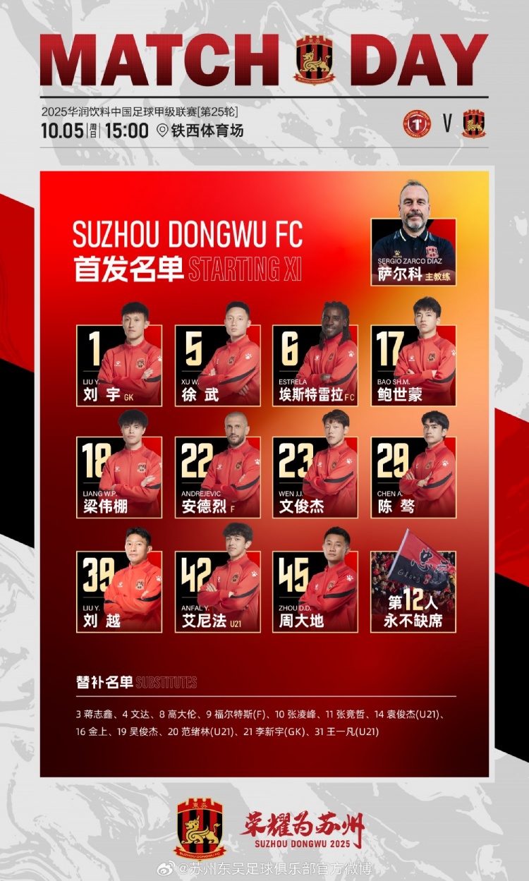 2025-10-05 16:02:04中甲联赛第25轮:辽宁铁人vs苏州东吴,首发名单